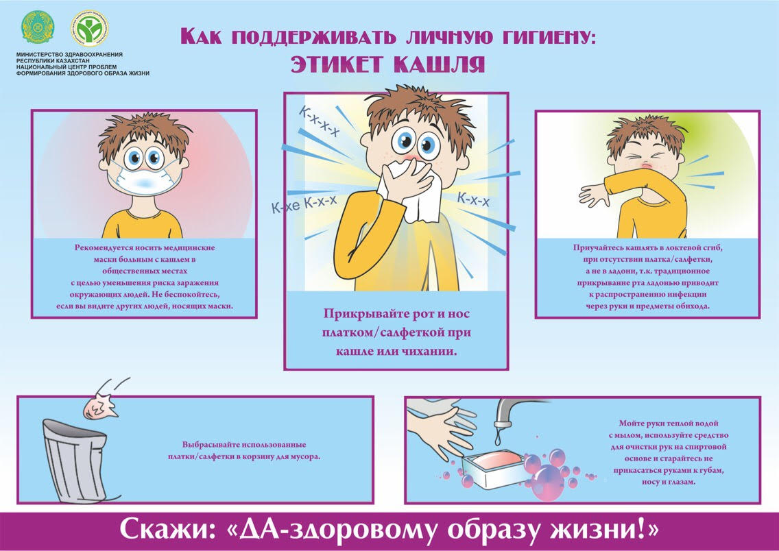 Учитывая путь заражения важно соблюдать правила личной гигиены. Ррекомендуется носить медицинские маски больным с кашлем в общественных местах с целью уменьшения риска заражения окружающих людей. Не беспокойтесь, если вы видите других людей, носящих маски. Прикрывайте рот и нос платком/салфеткой при кашле или чихании. Приучайтесь кашлять в локтевой сгиб, при отсутствии платка/салфетки, а не в ладони, т.к. традиционное прикрывание рта ладонью приводит к распространению инфекции через руки и предметы обихода. Выбрасывайте использованные платки/салфетки в корзину для мусора. Мойте руки теплой водой с мылом, используйте средство для очистки рук на спиртовой основе и старайтесь не прикасаться руками к губам, носу и глазам.