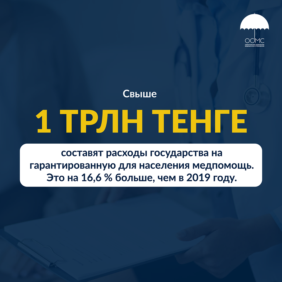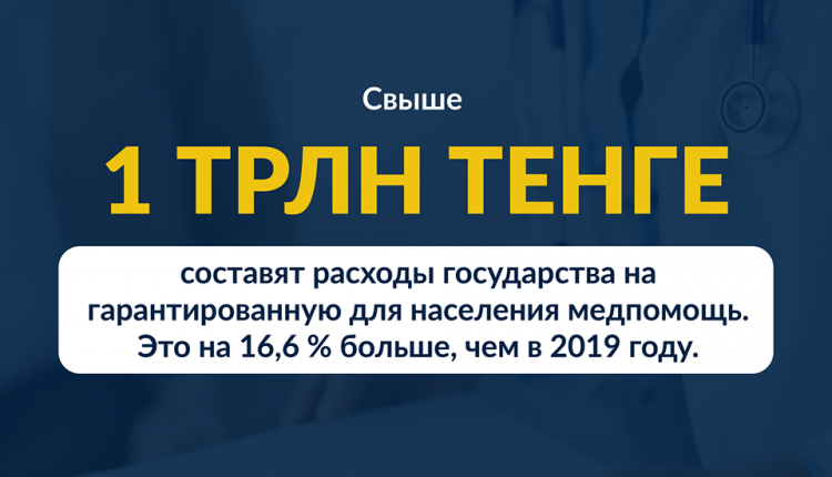 В этом году государство направляет на финансовое обеспечение гарантированного объема бесплатной медицинской помощи свыше 970 млрд тенге. В следующем, 2020 году, расходы государства на оказание медицинской помощи для населения увеличатся на 16,6 % и составят уже больше 1 трлн 134 млрд тенге.