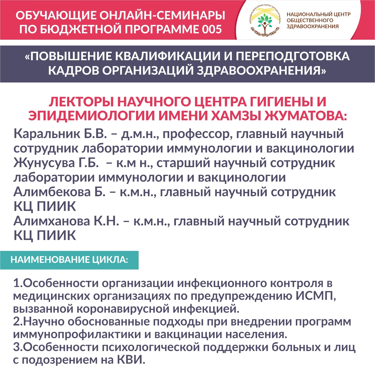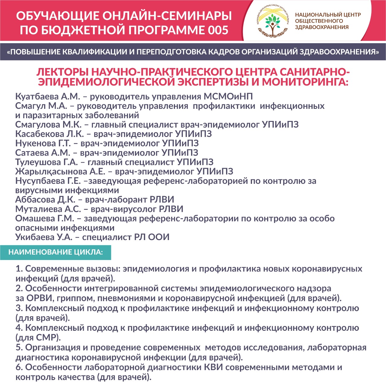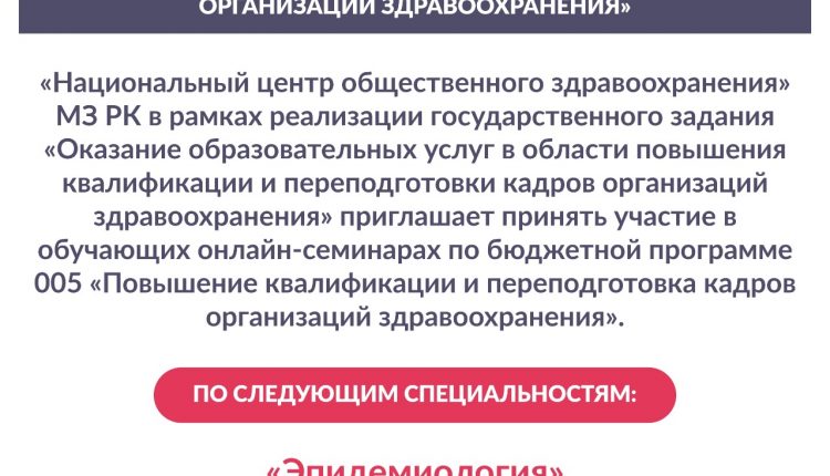 «Национальный центр общественного здравоохранения» МЗ РК в рамках реализации государственного задания «Оказание образовательных услуг в области повышения квалификации и переподготовки кадров организаций здравоохранения» приглашает принять участие в обучающих онлайн-семинарах по бюджетной программе 005 «Повышение квалификации и переподготовка кадров организаций здравоохранения».