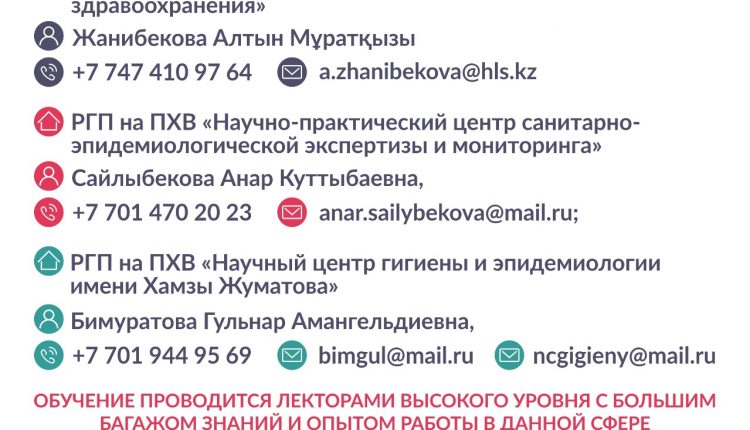 -РГП на ПХВ «Научный центр гигиены и эпидемиологии имени Хамзы Жуматова» – Бимуратова Гульнар Амангельдиевна, тел: +7 701 944 9569, e-mail: bimgul@mail.ru. Официальная почта: ncgigieny@mail.ru