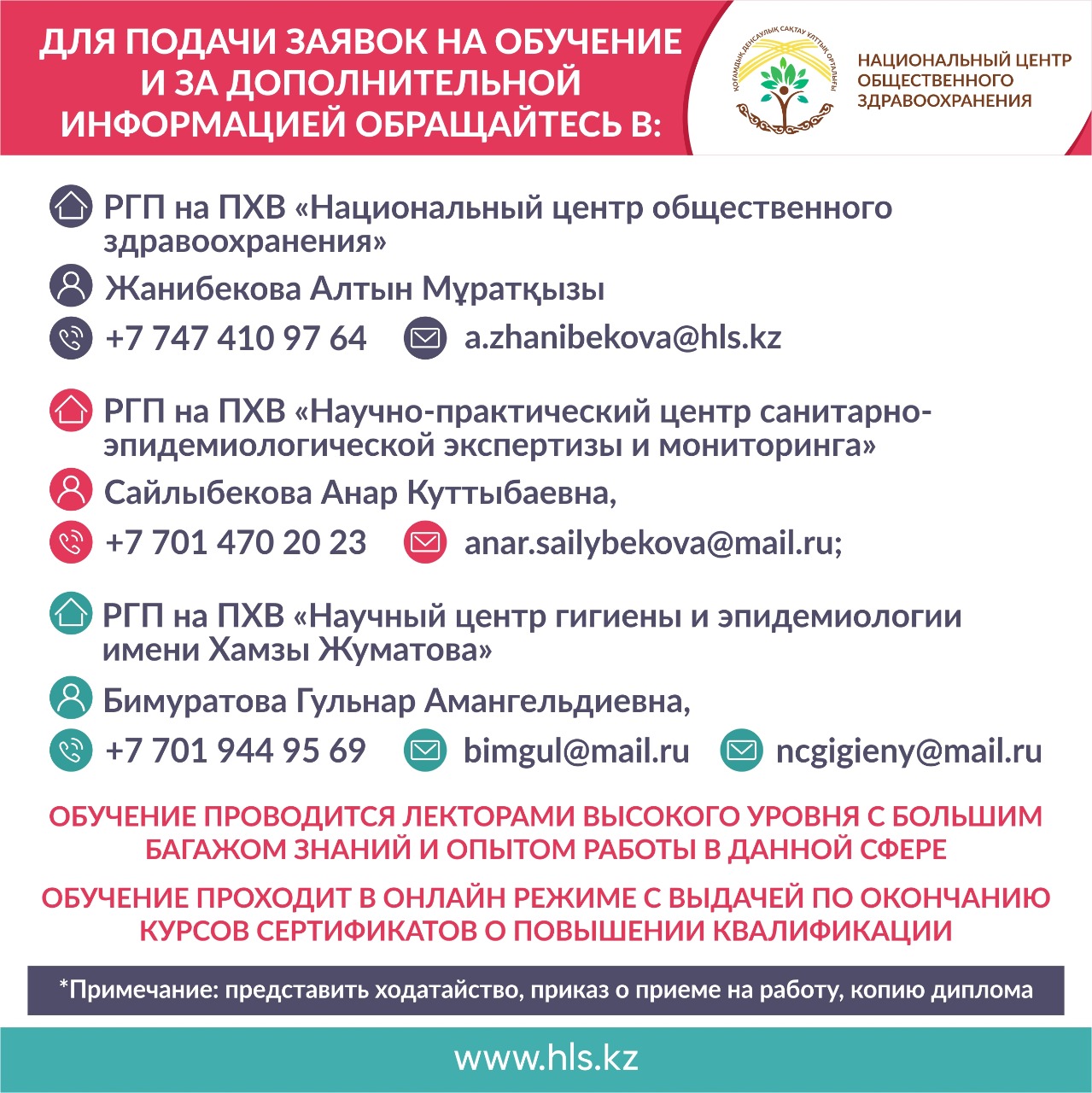 -РГП на ПХВ «Национальный центр общественного здравоохранения» – Жанибекова Алтын Мұратқызы, тел: +7 747 410 97 64,