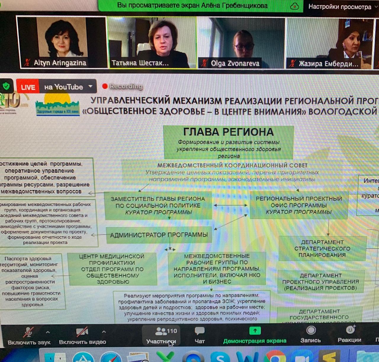 25 ноября 2020 года руководитель Центра укрепления общественного здоровья Национального центра общественного здравоохранения МЗ РК Жазира Ембердиева приняла участие в Форуме «Здоровые города России». На мероприятии она представила презентацию на тему «Национальная сеть Здоровые города и регионы Казахстана», где рассказала о принимаемых мерах по профилактике и снижению заболеваемости COVID-19 в Казахстане.