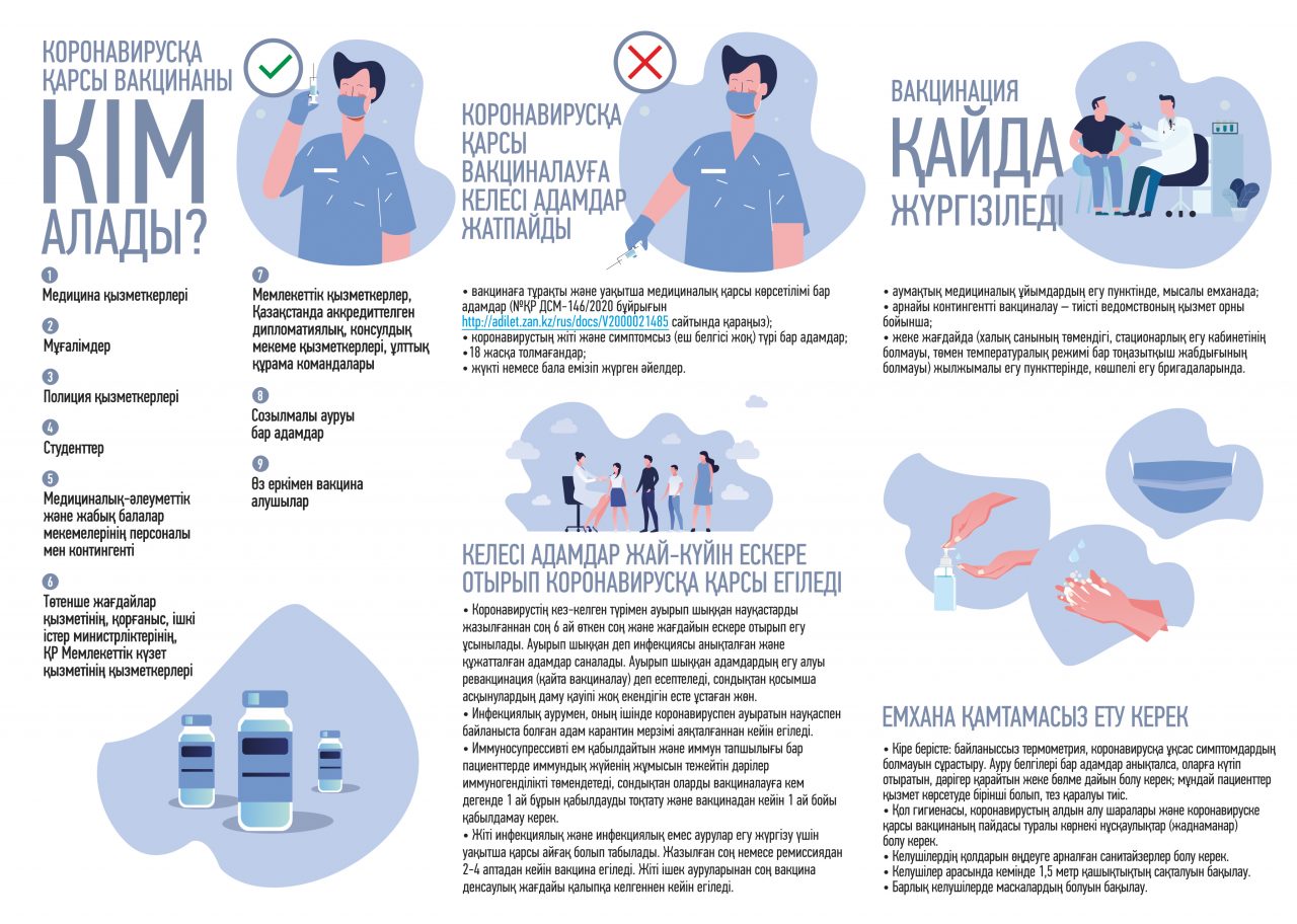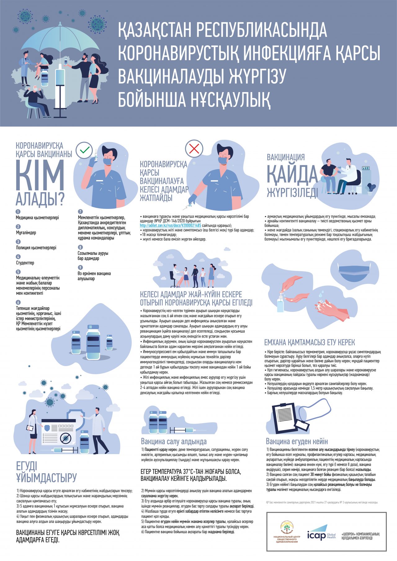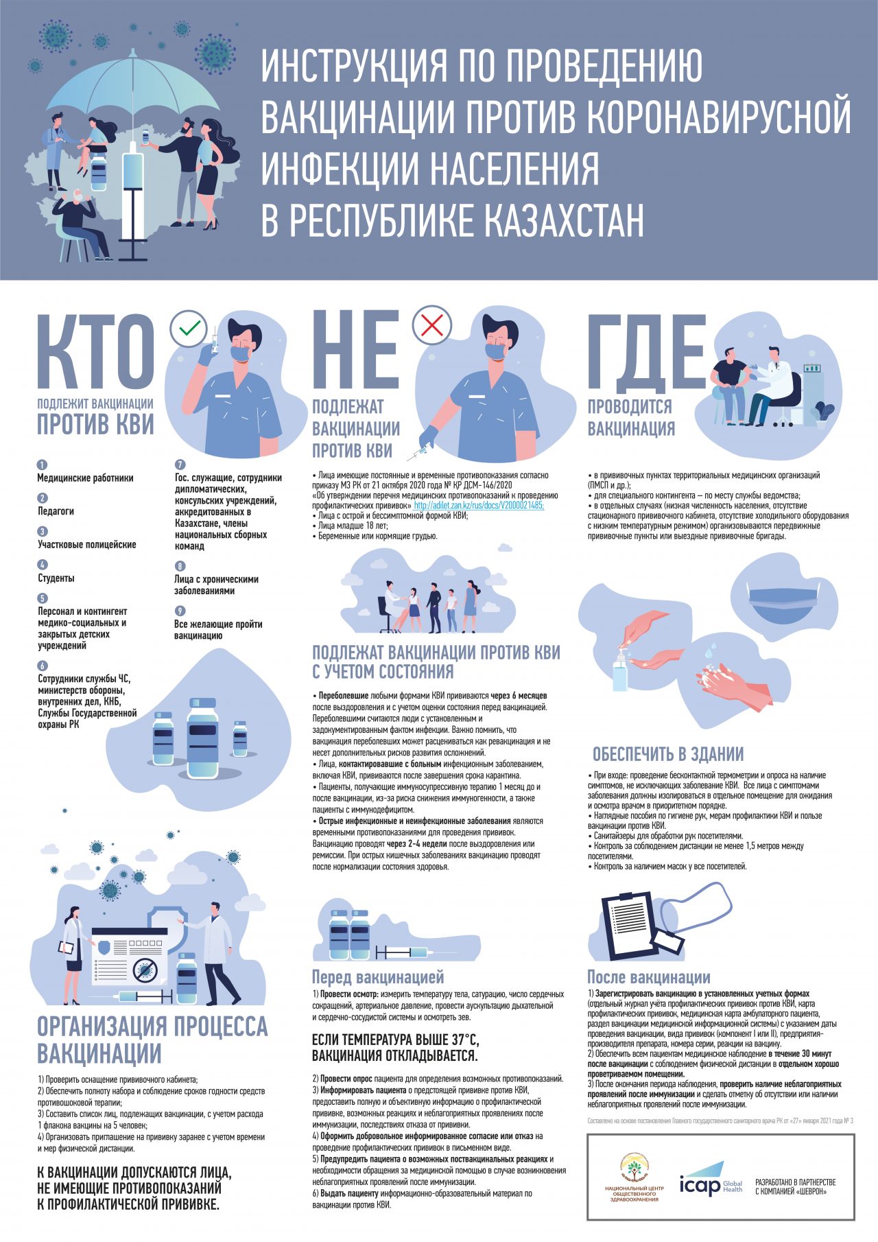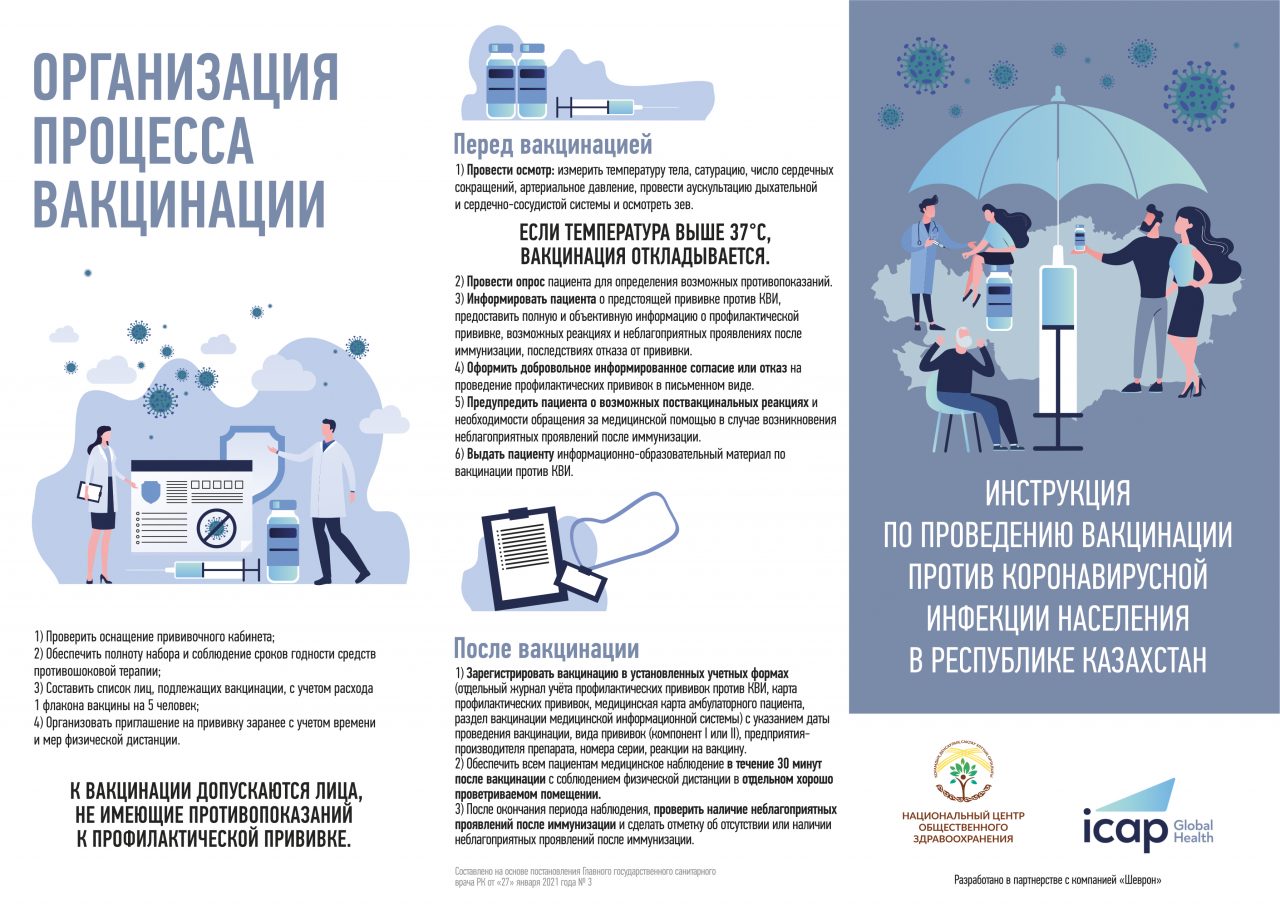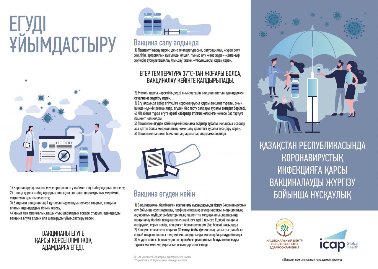 Инструкция по проведению вакцинации против коронавирусной инфекции населения в Республике Казахстан для медицинских работников и памятки пациентам по вакцинации против коронавирусной инфекции разработаны Национальным центром общественного здравоохранения МЗ РК и ICAP при Школе общественного здравоохранения Колумбийского университета в Республике Казахстан в партнерстве с компанией «Шеврон».