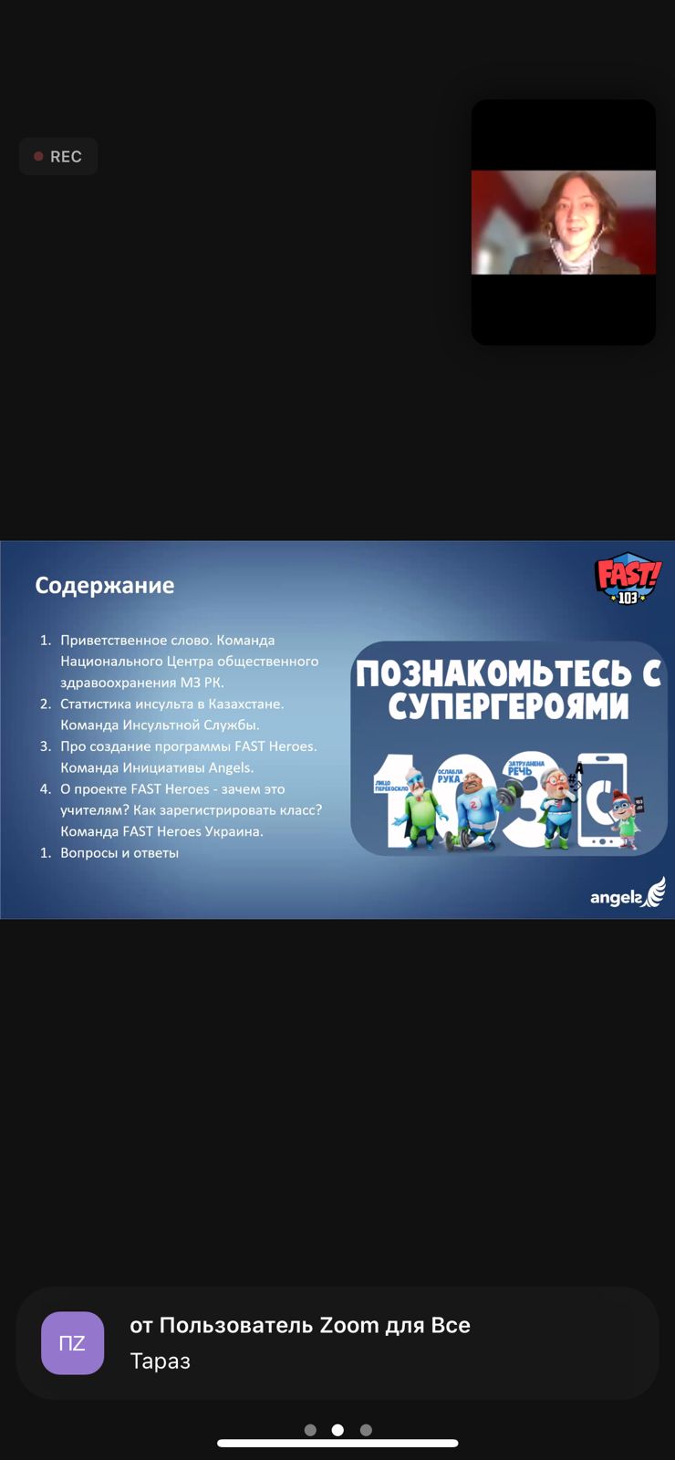Национальный центр общественного здравоохранения МЗ РК (НЦОЗ) провел вебинар через платформу Zoom для учителей по проекту «Супергерои FAST». Образовательная программа «Супергерои FAST» – международная кампания, которая проводится в более чем в 20 странах мира, и за 2 года обучение прошли около 250 тысяч детей. Программа разработана Angels Initiative вместе с факультетом образовательной и социальной политики Университета Македонии и одобрена Всемирной организаций инсульта.