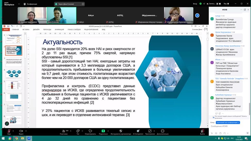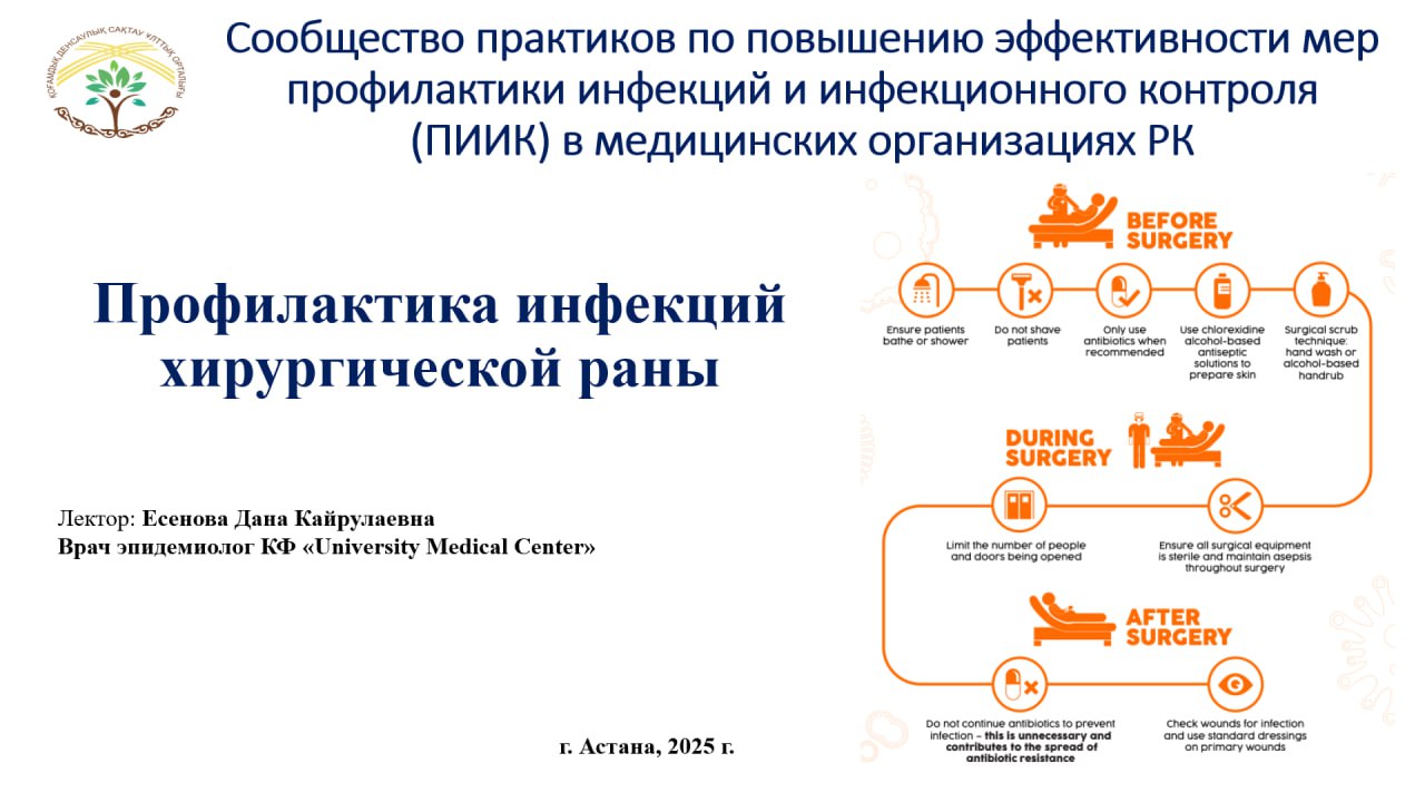 12 февраля 2025 года в рамках очередной встречи Сообщества практикующих госпитальных эпидемиологов ПИИК состоялось выступление врача-эпидемиолога Корпоративного Фонда «University Medical Center» Есеновой Даны Кайрулаевны на тему «Профилактика инфекций хирургической раны».