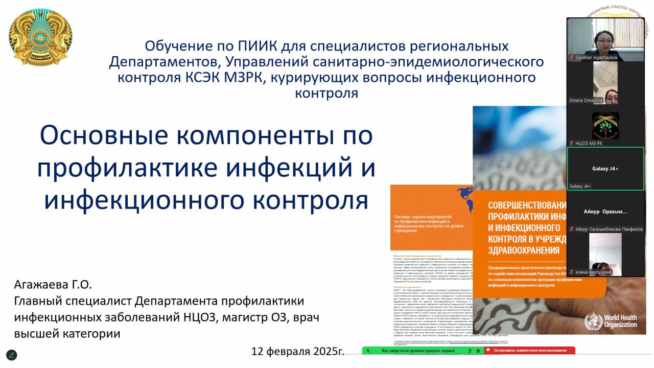 В рамках реализации Национального Плана по профилактике инфекций и инфекционного контроля (далее ПИИК) и в целях повышения знаний о стандартах и передовых практик ПИИК 12 февраля 2025 года проведен семинар в онлайн формате со специалистами Департаментов и Управлений санитарно-эпидемиологического контроля КСЭК МЗРК, где с докладом об основных компонентах ПИИК выступила главный специалист Департамента профилактики инфекционных заболеваний НЦОЗ Агажаева Г.О.
