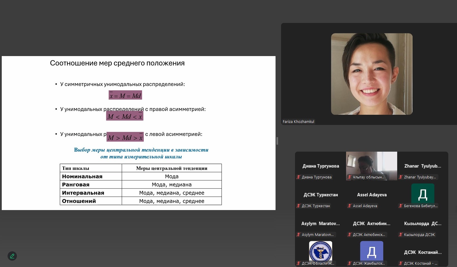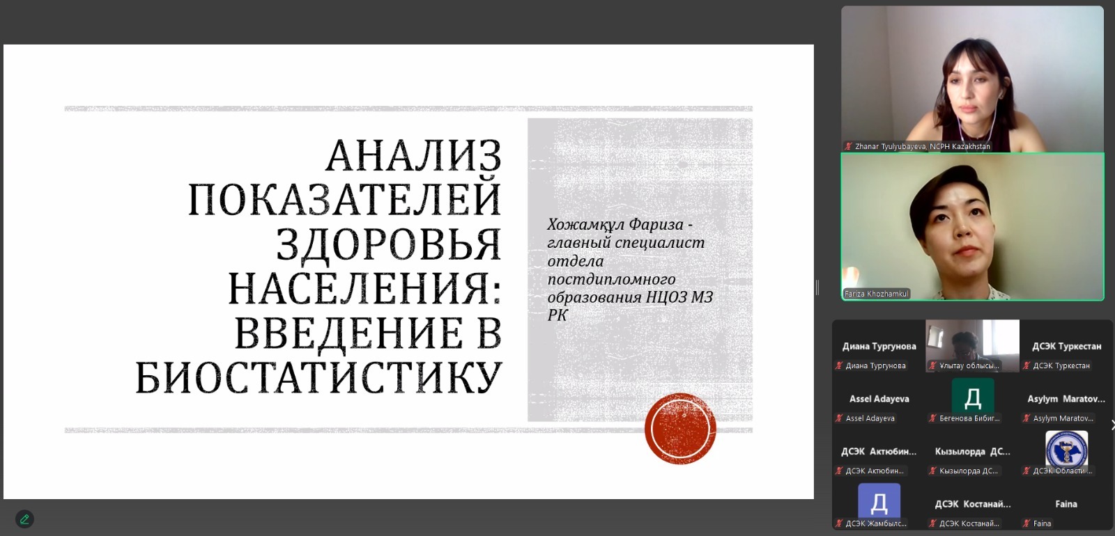 18 июня 2025 года РГП на ПХВ «Национальный центр общественного здравоохранения» МЗ РК провёл онлайн-семинар, посвящённый основам биостатистики и анализа данных в сфере общественного здравоохранения. Участниками стали более 35 специалистов отделов мониторинга, анализа и оценки рисков департаментов санитарно-эпидемиологического контроля из всех регионов Казахстана, включая специалистов ДСЭК на транспорте.