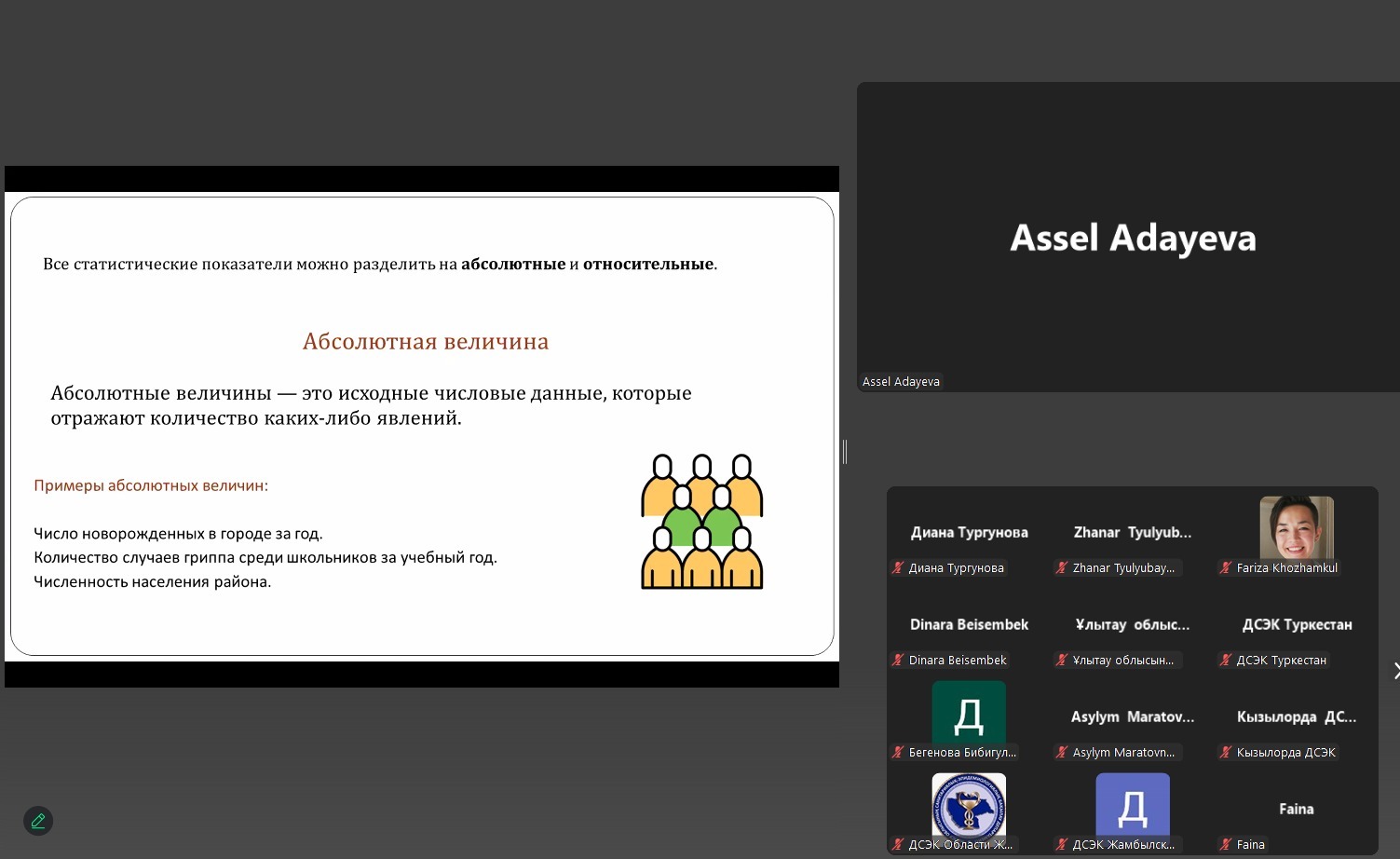 Фариза Хожамқұл, главный специалист отдела постдипломного образования НЦОЗ, выступила с докладом «Анализ показателей здоровья населения: введение в биостатистику», в котором были рассмотрены ключевые понятия, методы сбора, обработки и анализа данных, а также их практическое применение в повседневной работе специалистов.
