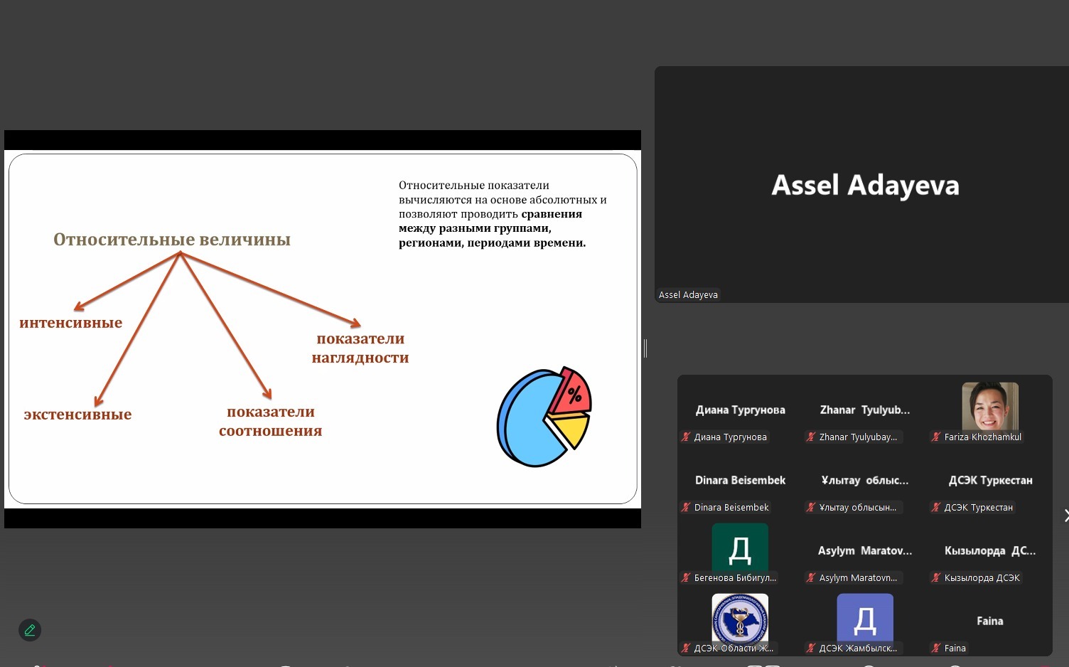 Асель Адаева, главный специалист Центра профилактики и укрепления здоровья ННЦРЗ им. С. Каирбековой, представила доклад «Показатели заболеваемости в медицинской статистике: расчёт и интерпретация». Внимание было уделено видам показателей, методам расчёта и интерпретации, а также возможностям использования этих данных для выявления тенденций и факторов риска.